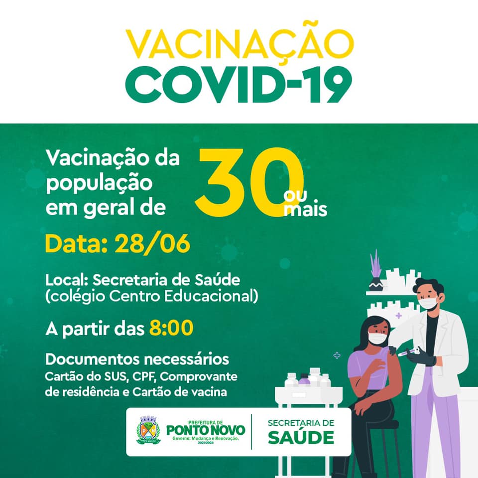 Atenção para os critérios dessa etapa da vacinação: População em geral 30 anos ou maisLocal da vacinação: Secretaria de Saúde (antigo centro educacional)